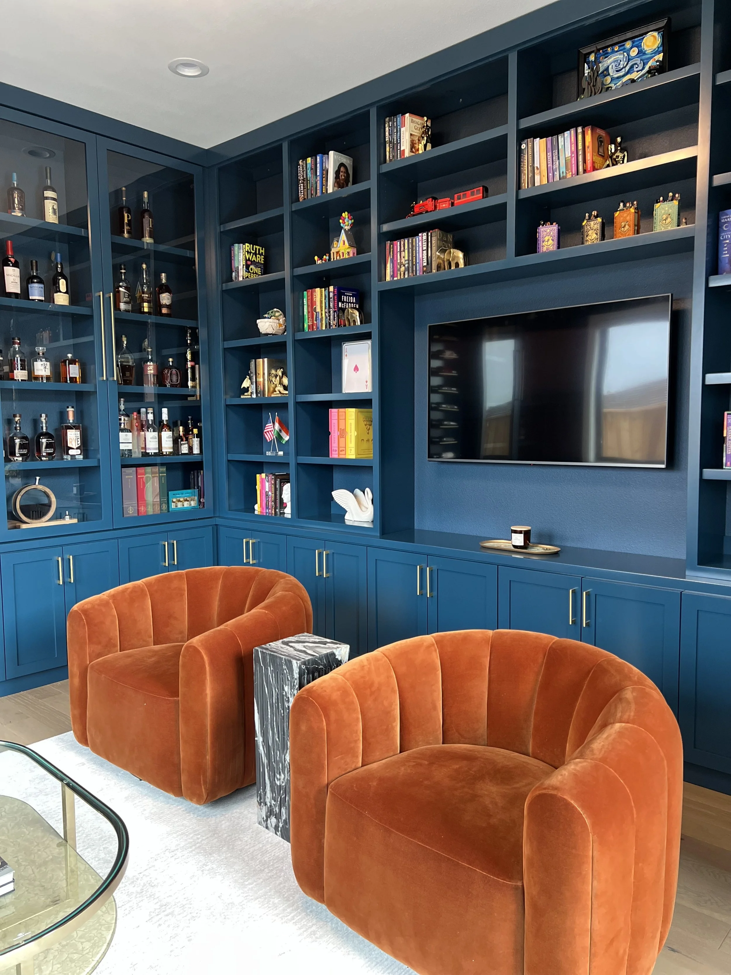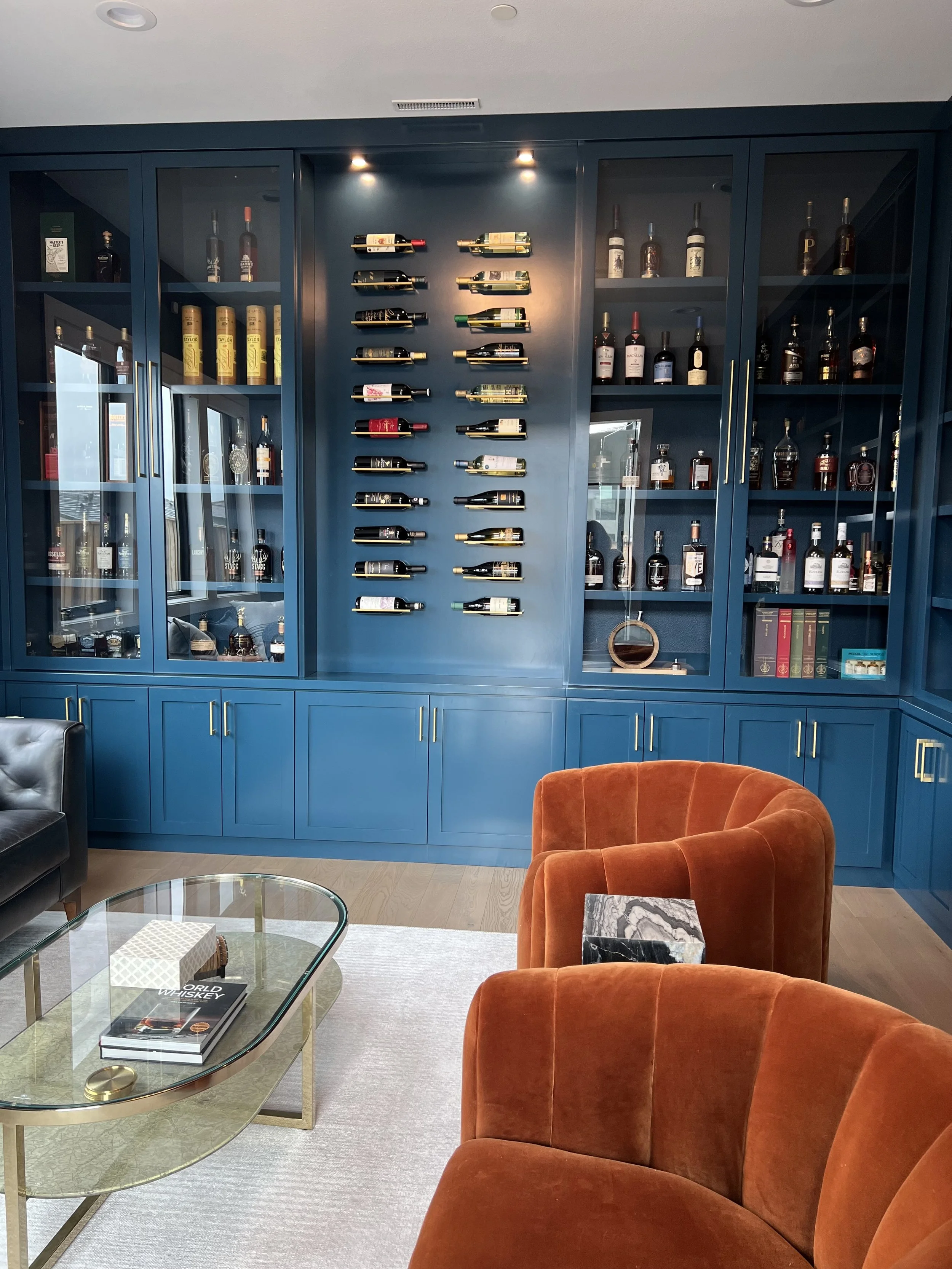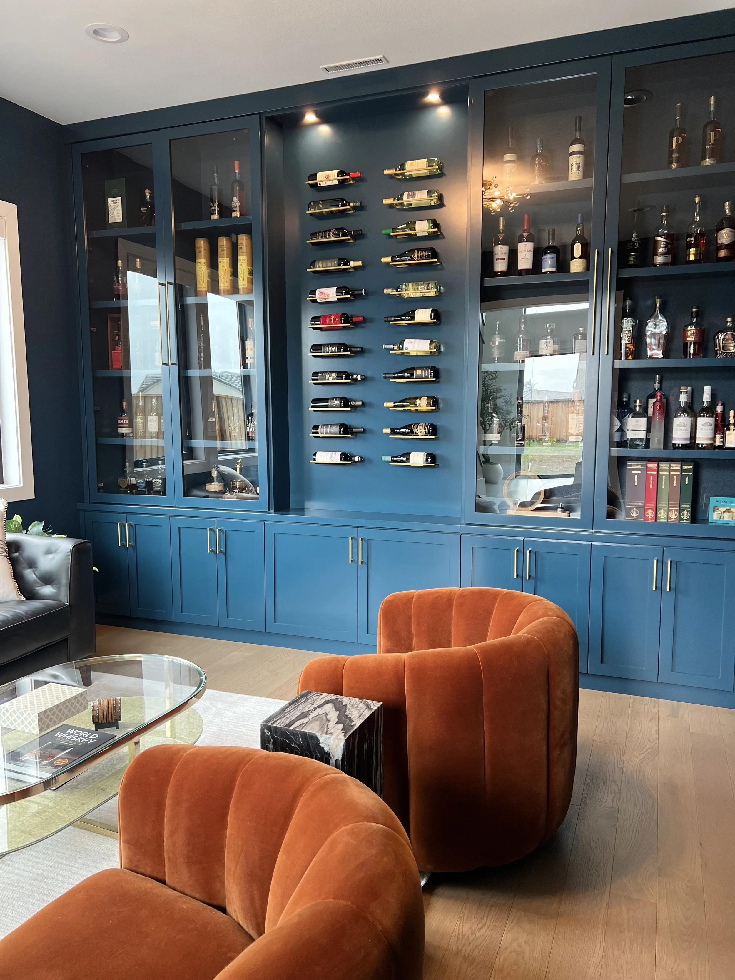 We transformed this blank canvas into a sophisticated whiskey, wine and library room for our clients to enjoy and relax in. We designed floor to ceiling bookshelves that will be a landing place for their favorite books and cocktails. By curating a bold color palette that balances richness and yet feels deeply inviting. It's an intimate setting that feels like a private retreat perfect for an evening to unwind in.