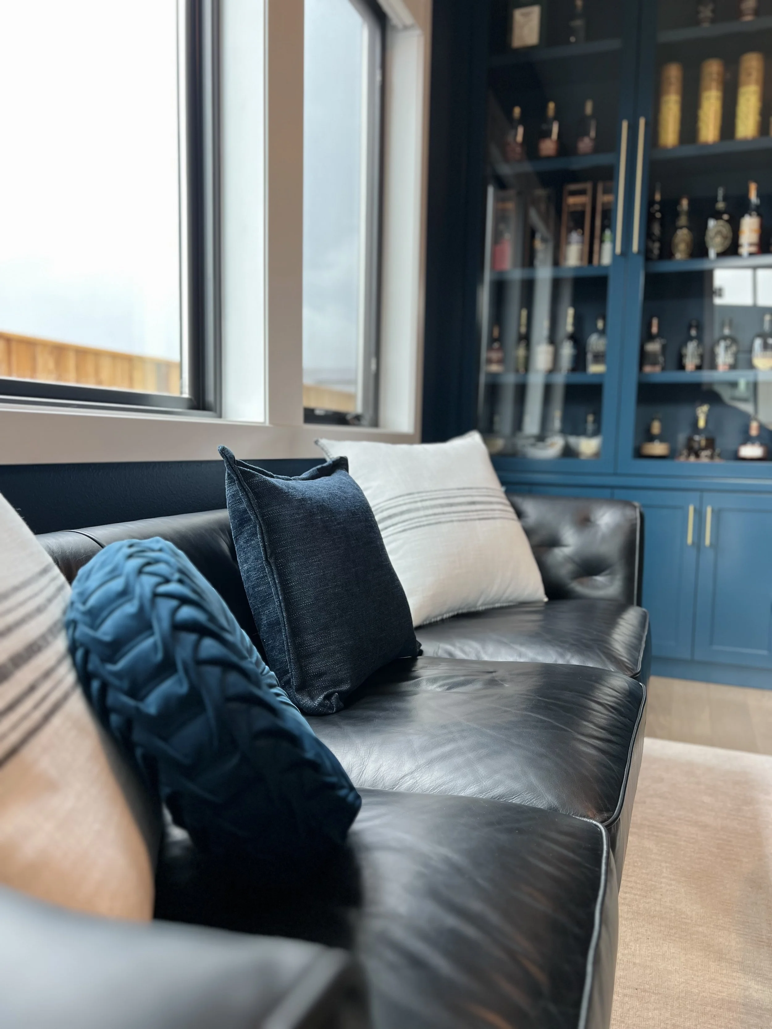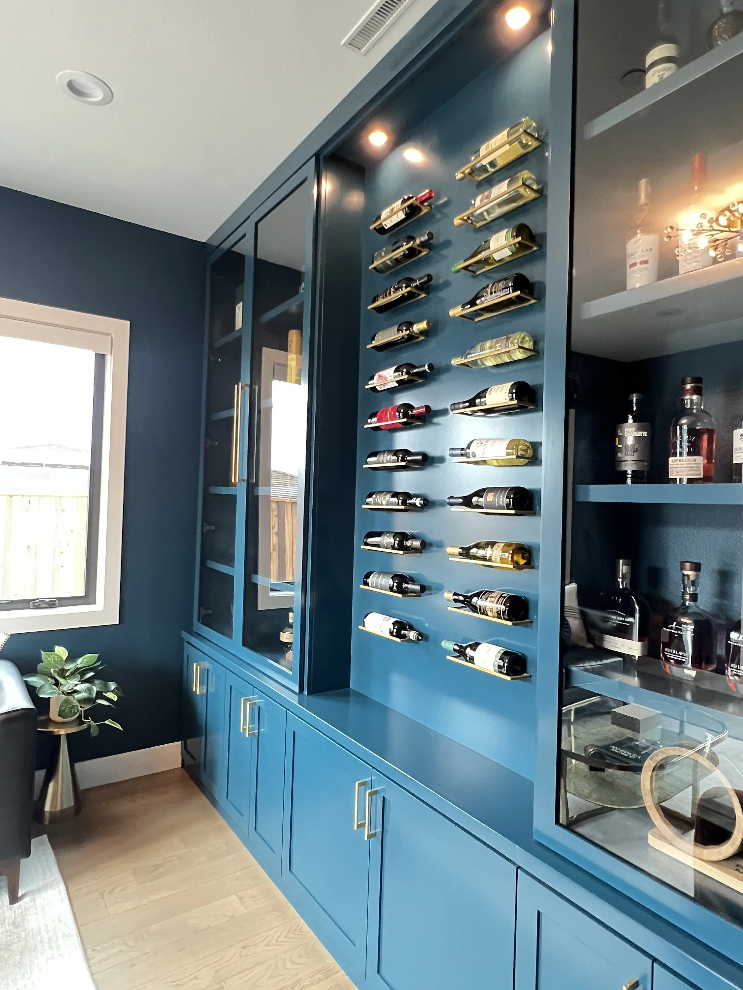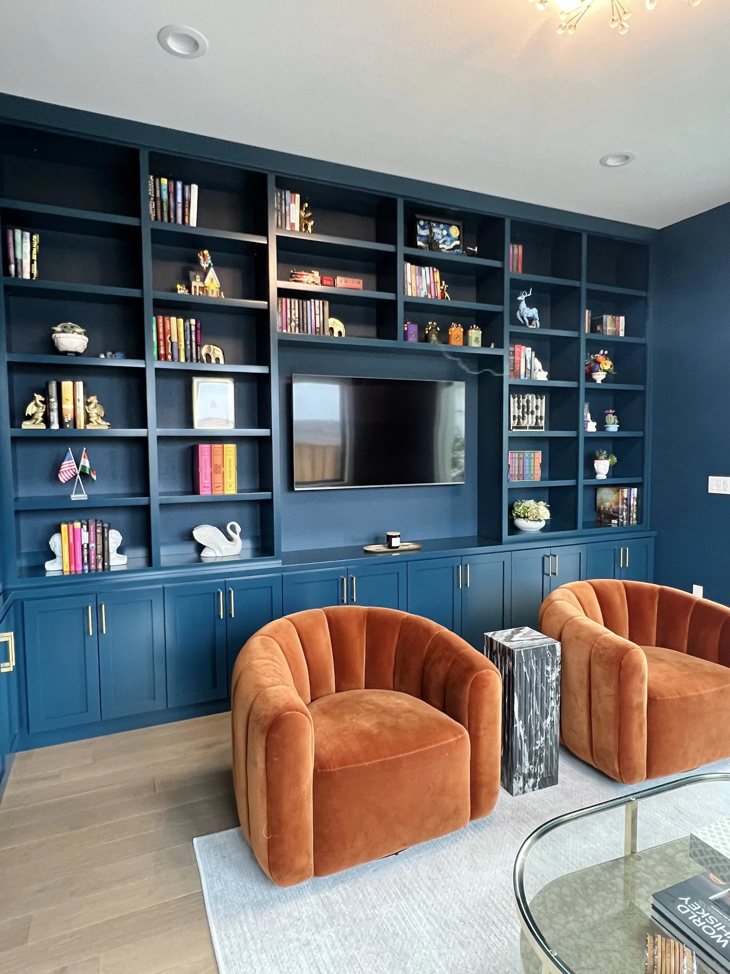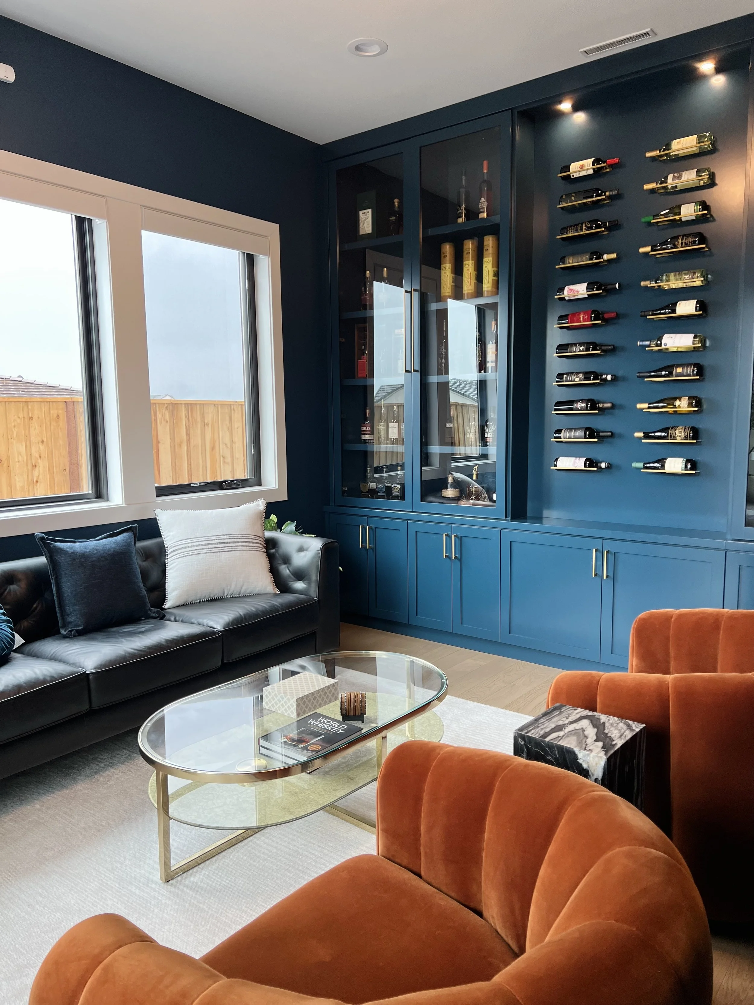 We transformed this blank canvas into a sophisticated whiskey, wine and library room for our clients to enjoy and relax in. We designed floor to ceiling bookshelves that will be a landing place for their favorite books and cocktails. By curating a bold color palette that balances richness and yet feels deeply inviting. It's an intimate setting that feels like a private retreat perfect for an evening to unwind in.