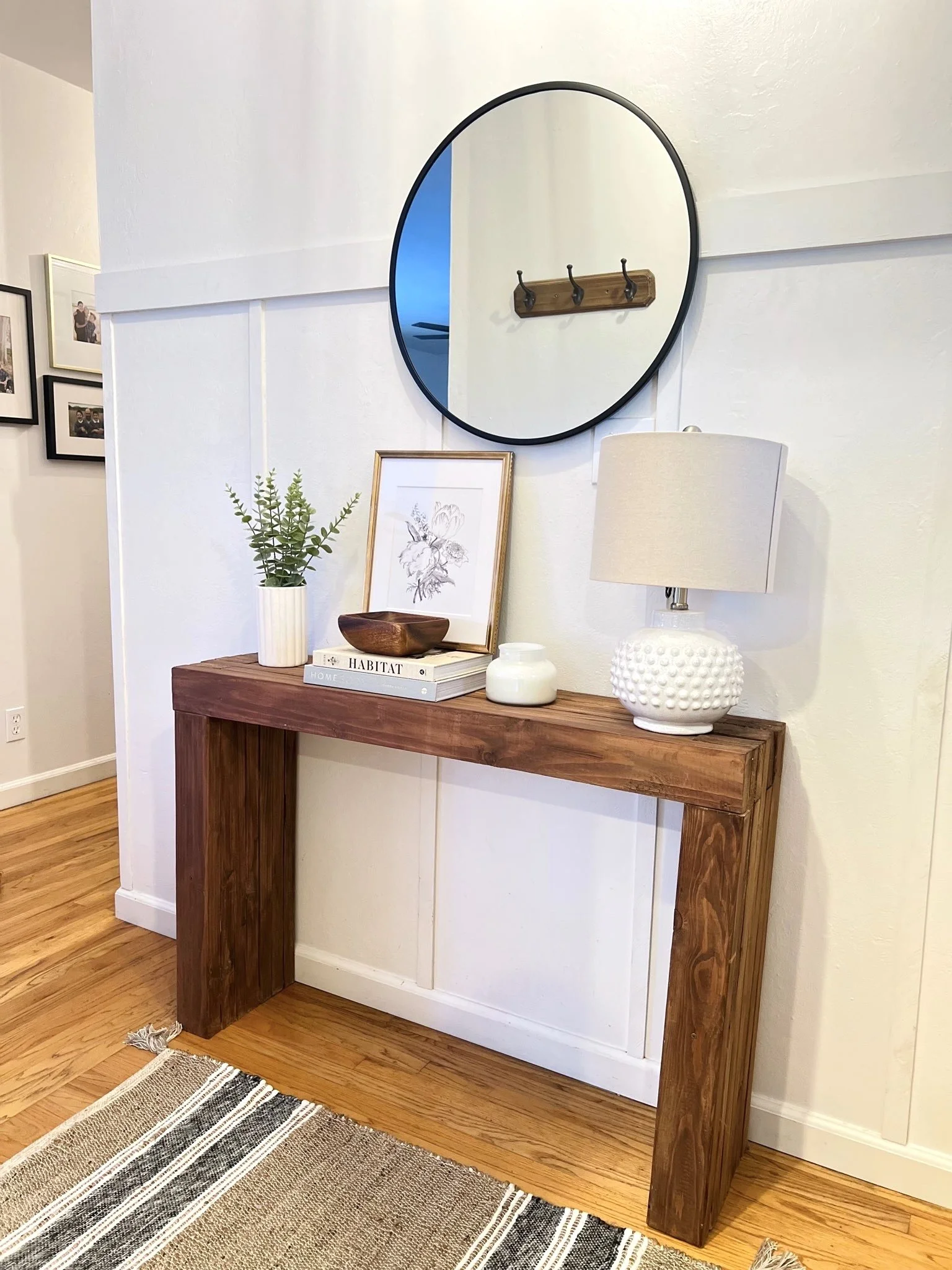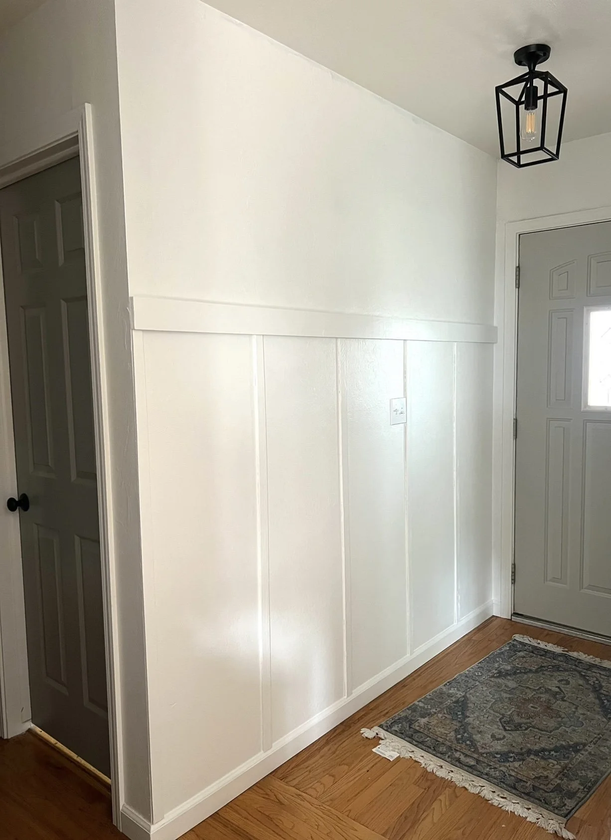 It all begins with your homes entrance. We took this entryway from simple to bright and stylish. We incorporated white fresh paint and board and batten for a fresh new look. A mirror and a console table with extra lighting make this entry inviting, stylish and functional.